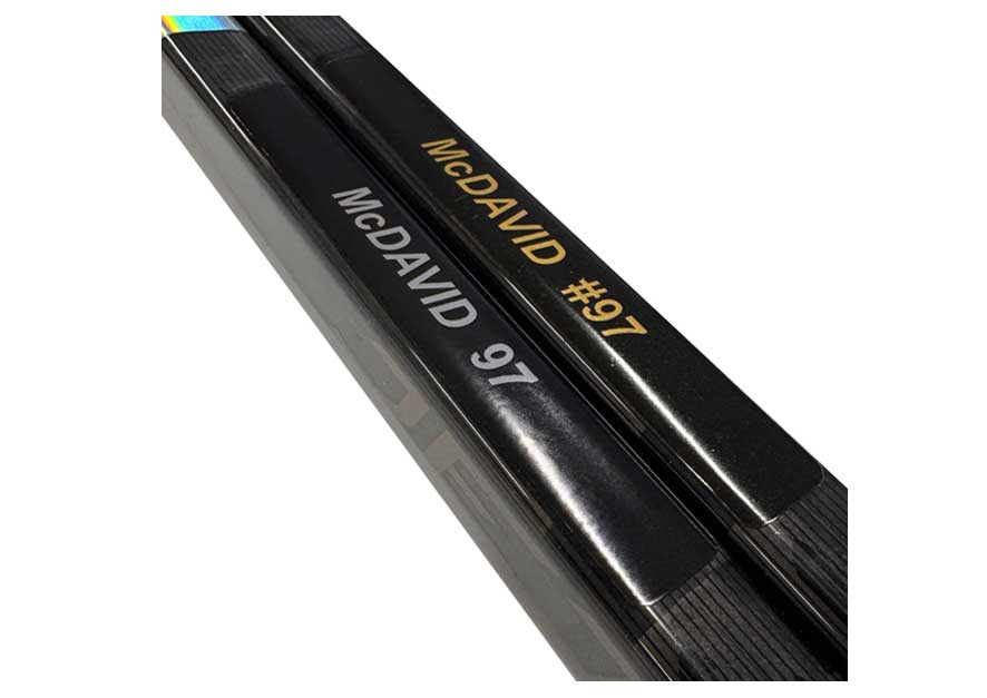 Customizable Text-Only Design – Unlike full-color logo decals, this product focuses on clean black stickers accented by your choice of special text colors — ideal for names, numbers, and player identification that stands out on any stick. (Available in Gold, Silver and White Text)